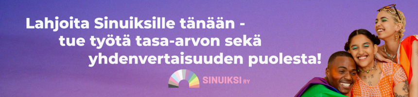 Tänään 9.4.2026 juhlistamme Sinuiksi ry:n 53-vuotista taivalta. Jo yli puolen vuosisadan ajan yhdistys on tehnyt arvokasta työtä sateenkaari-ihmisten hyvinvoinnin, yhteisöllisyyden ja vertaistuen eteen. Tämä työ on edelleen yhtä tärkeää kuin ennen, ellei nykyajassa jopa entistä tärkeämpää, ja sen mahdollistavat te, yhteisömme jäsenet ja tukijat.